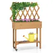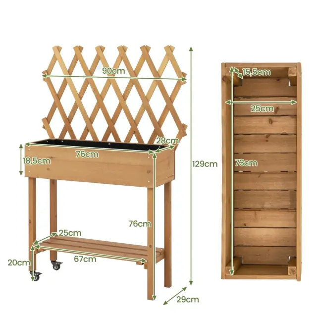 Naša lesena dvignjena greda z rešetko meri 90 x 29 x 129 cm (d x š x v), zaboj za sadike pa 76 x 28 x 18,5 cm (d x š x v). Velik zaboj za sadike je primeren za gojenje različnih rastlin, kot so cvetje, zelišča, zelenjava in sadje, plezalna rešetka pa zagotavlja oporo plezalnim rastlinam. Poleg tega ima na dnu vdolbine in podlogo iz tkanine, ki omogoča lažje odtekanje odvečne vode ter omogoča dihanje rastlin in korenin. Poleg tega je izdelana iz 100-odstotnega naravnega lesa jelke, ki je odporen na deformacije, vremenske vplive in trpežen, zato je ta vrtna postelja odlična izbira za vsak projekt vrtnarjenja v zaprtih prostorih ali na prostem. Z višino gredice 76 cm ščiti vaše rastline pred malimi živalmi, hkrati pa omogoča enostaven dostop za zalivanje. Zahvaljujoč dvema kolesoma z možnostjo zaklepanja lahko svoj zeleni raj preprosto premikate, da ujame popolno količino sončne svetlobe ali zaščiti občutljive rastline pred neugodnimi vremenskimi razmerami.