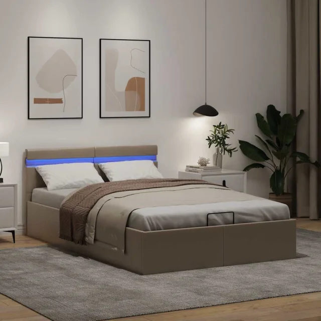 Prašno barvan jeklen okvir in vezane letve so še bolj trdni in vzdržljivi. Ta postelja za shranjevanje, oblazinjena v svetleče umetno usnje, izgleda privlačno in je enostavna za vzdrževanje. To pohištvo za spalnico je primerno za ležišče velikosti 120 x 200 cm. To posteljo odlikuje LED osvetlitev, ki jo je mogoče preprosto nastaviti in tako ustvariti posebno svetlobno predstavo. Prilagodite lahko načine, barve in svetlost ter tako izboljšate vzdušje v notranjem prostoru. Ta izdelek je preprost za montažo.