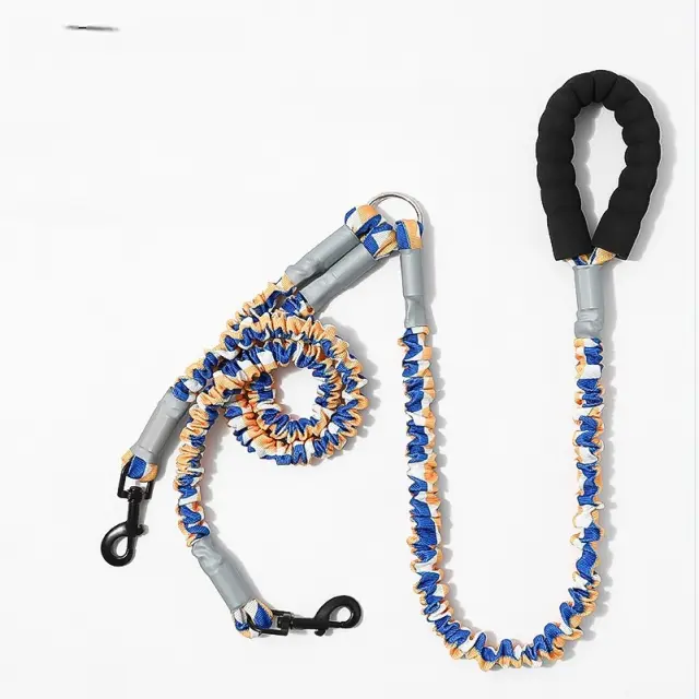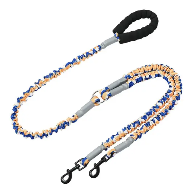 Blažilni bungee: Vgrajene bungee vrvice na glavni in sekundarni vrvici delujejo kot blažilniki udarcev, ki zmanjšujejo vpliv nenadnih vlečenj in izpadov vaših psov. Ta funkcija zmanjšuje obremenitev vaših rok in ramen, kar zagotavlja bolj udobno in nadzorovano izkušnjo hoje. Bungee vrvice so izdelane iz visokoelastičnega materiala, ki je sposoben prenesti znatno silo, ne da bi izgubil obliko ali učinkovitost. Ta blažilna zasnova je idealna za lastnike z več psi ali psi, ki so nagnjeni k vlečenju, kar zagotavlja varnejši in prijetnejši sprehod za vse.