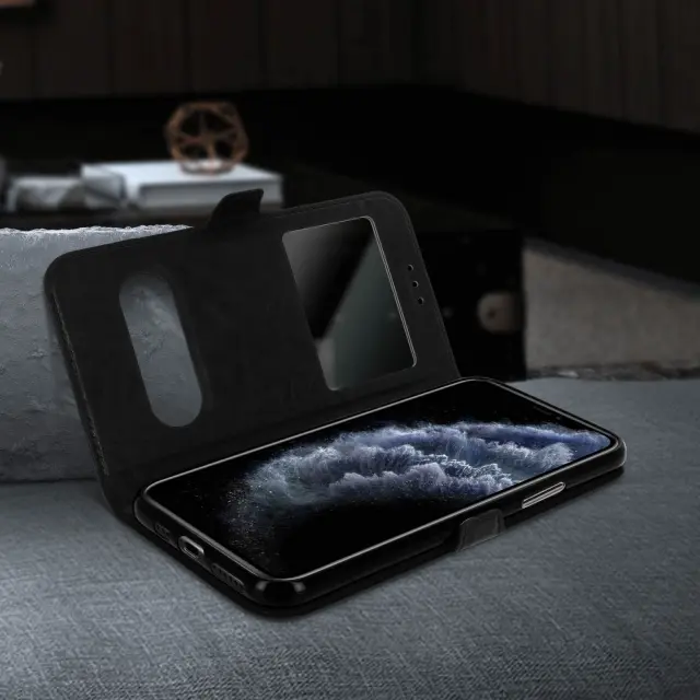 Zaščitna torbica posebej zasnovana za Apple iPhone 11 Pro. Popolnoma ščiti vaš pametni telefon pred vsakodnevnimi udarci in praskami. Trezen in eleganten dizajn s prevleko iz teksturiranega eko usnja. Velik zaslon za ogled obvestil, ure itd.