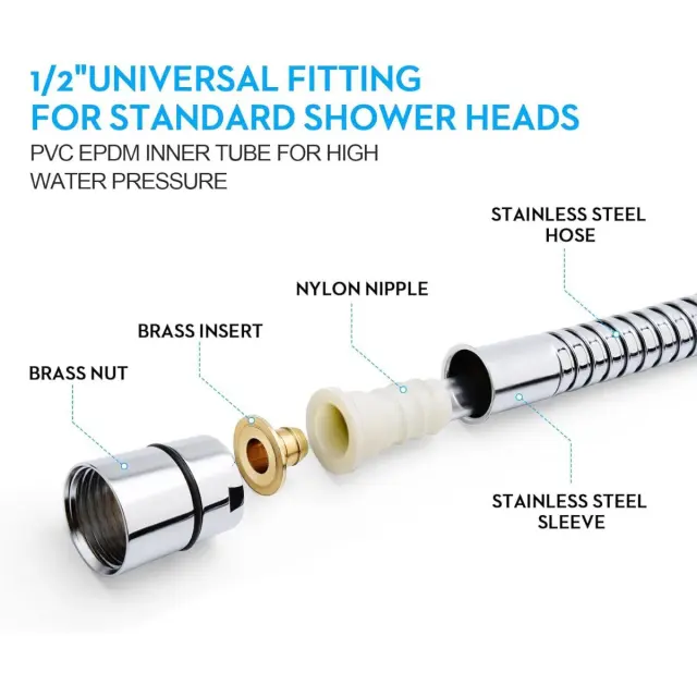 Vzdržljiv material: Prosimo, upoštevajte: to niso originalni deli. Izdelano iz korozijsko odpornega nerjavečega jekla in trdnega bakra, ta tuš cev zagotavlja zanesljiv pretok vode in dolgotrajno delovanje. Materiala nudita enakomeren sijoč srebrn videz, odporen na vsakodnevno uporabo v domovih, hotelih in najemnih enotah, kjer je potrebna trajnost in estetska konsistenca.