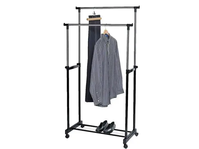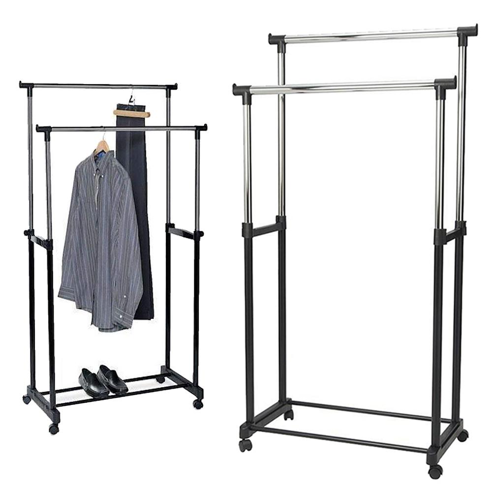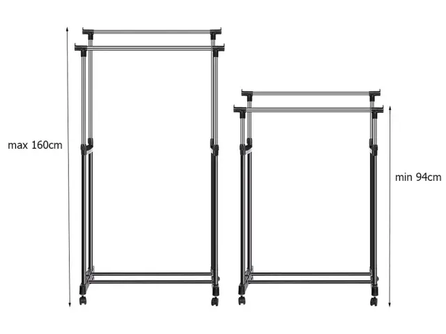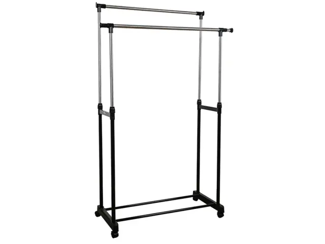 Dvojni teleskopski obešalnik na kolesih je popolna rešitev na vsakem mestu, kjer potrebujete priročno stojalo za oblačila. Popoln za dom, pisarno, trgovino ali frizerski salon.