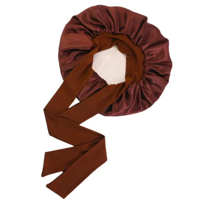 Dvoslojna satenasta elastična spalna kapa s trakovi - kava