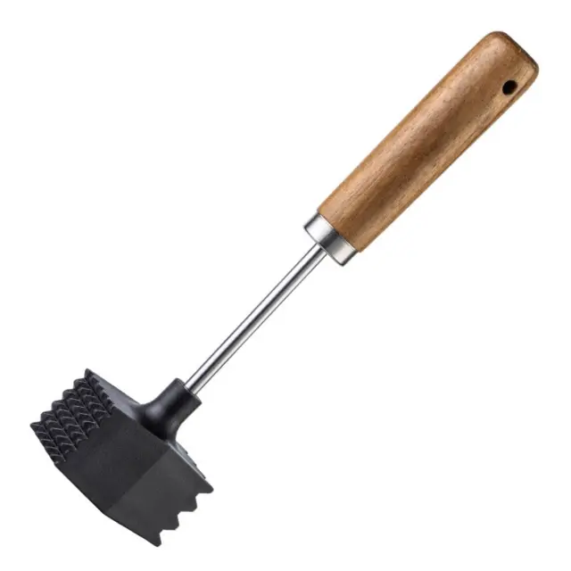 Ergonomski akacijev ročaj: Ročaj iz akacijevega lesa je oblikovan za udoben in varen oprijem med ponavljajočimi se udarci, kar zmanjšuje zdrs in omogoča bolj nadzorovano uporabo. Zaradi naravne strukture lesa se ročaj počuti uravnotežen v roki, kar pomaga pri natančnem stiskanju in ravnanju mesa pri različnih nalogah, od nežnega razploskanja do intenzivnega tenderiziranja debelejših kosov. Primeren je tako za občasne domače uporabnike kot tudi za kuharske profesionalce.