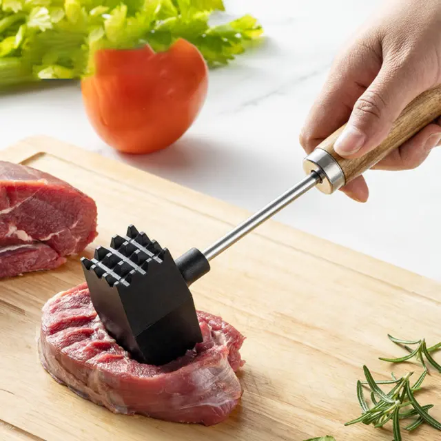 Dvostranska natančnost: Predstavljajte si pripravo zrezka pred pečenjem: dvostranski inox glavi z grobo in fino površino omogočata natančno lomljenje mišičnih vlaken, kar izboljša vpijanje marinade in zagotavlja enakomerno debelino. Ta lastnost pomaga doseči enakomerne rezultate pečenja tako v domači kuhinji kot v profesionalnem okolju, saj omogoča dosledno izboljšanje teksture in bogatejši okus brez dodatnih zapletenih postopkov. Pogosto uporabljeno orodje za konsistentne rezultate pri vseh kosih.