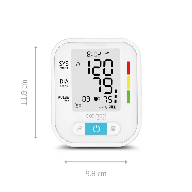 ECOMED BU-95E omogoča natančno merjenje krvnega tlaka na nadlakti in zanesljivo razvrščanje izmerjenih vrednosti s pomočjo barvne lestvice semaforja.