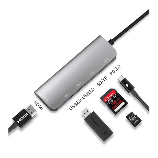 Eko, Razdelilnik 6v1 HDMI4K SD Micro-SD USB 3.0 USB-C na USB tipa C, Siva