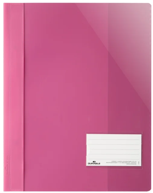 z okencem za označevanje 90 x 57 mm, prozorna sprednja platnica, barvna hrbtna stran, pokrit šivalni mehanizem, notranji žep na zadnji strani za neluknjane dokumente (269034) Pomembni podatki: Izvedba: PVCFormat: A4+Barva: temno roza Širina embalaže v mm: 245V