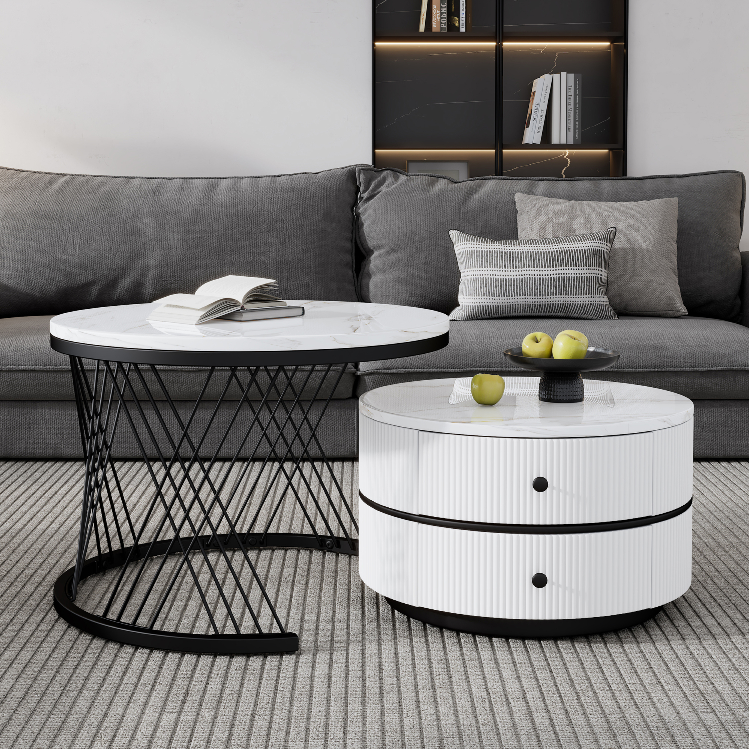 Elegantna dvodelna bela klubska mizica z marmornim videzom in dvema predaloma.