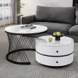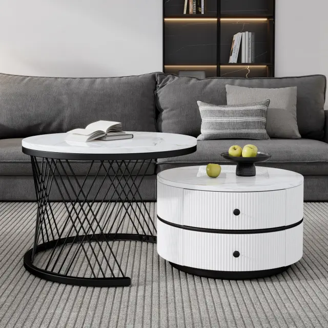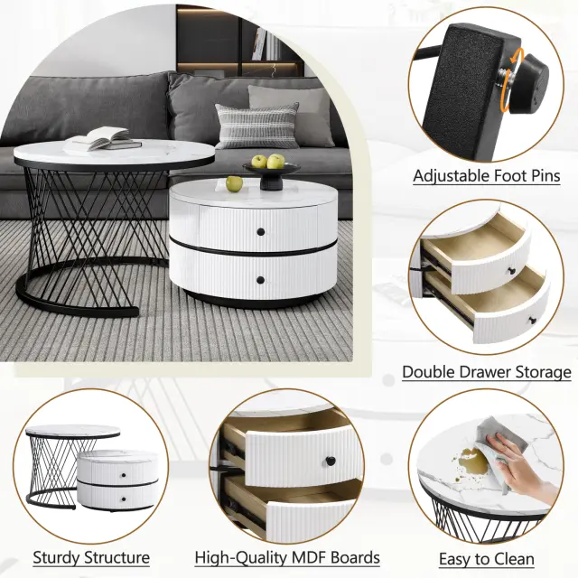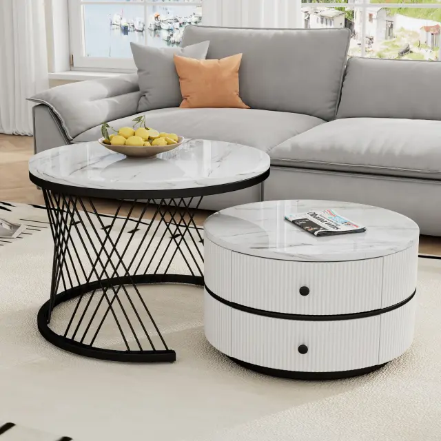 Ta elegantni komplet klubskih mizic z marmornim učinkom je sestavljen iz dveh okroglih mizic (60 x 60 x 46 cm in 50 x 50 x 31 cm) z visokosijajnim zaključkom. Manjša mizica ima dva predala. Vsaka mizica lahko prenese do 30 kg.