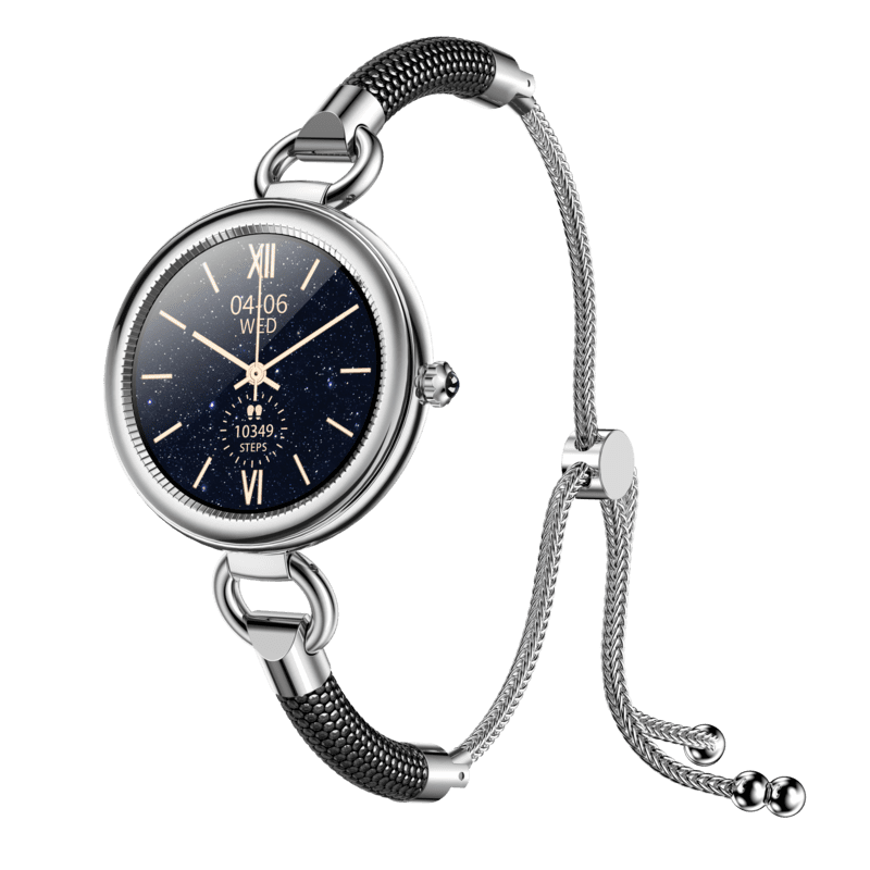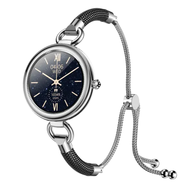 Eleganten dizajn: Pametna ura ima eleganten in moderen dizajn z okvirjem iz smole in cinkove zlitine ter udobno tekstilno zapestnico. Zaradi vitkega profila in črne barve je lep dodatek, ki je primeren za vse priložnosti.