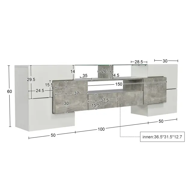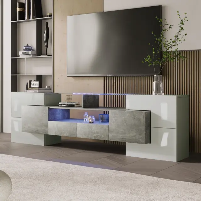 Elegantna TV omarica z LED osvetlitvijo, sijajno stekleno površino in trpežno konstrukcijo. Enostavna montaža. 200 x 30 x 60,7 cm. Bela/betonska.