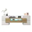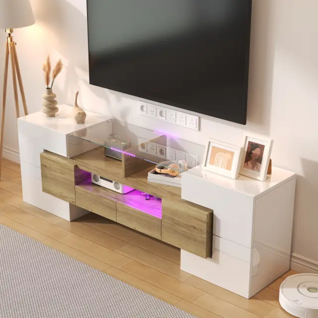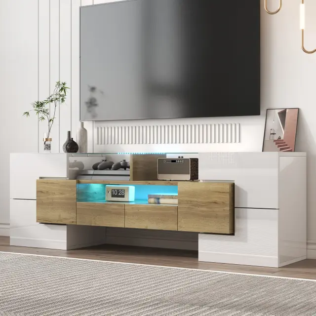 Elegantna TV omarica v visokosijajni beli barvi z LED osvetlitvijo, 145 cm.