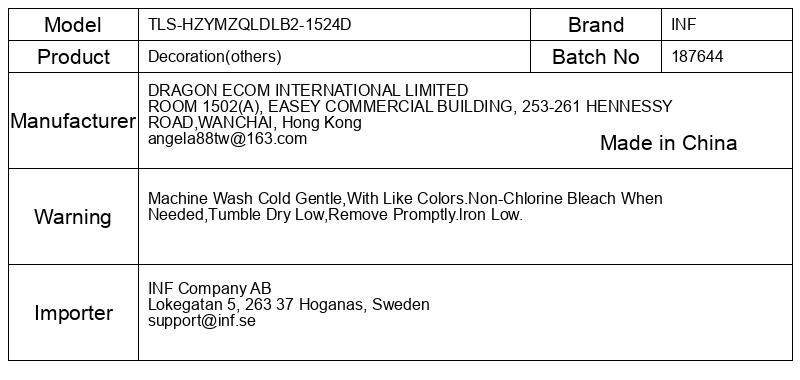 Strojno pranje, hladno, nežno, s podobnimi barvami. Belilo brez klora, ko je potrebno, suho v sušilnem stroju, takoj odstranite.