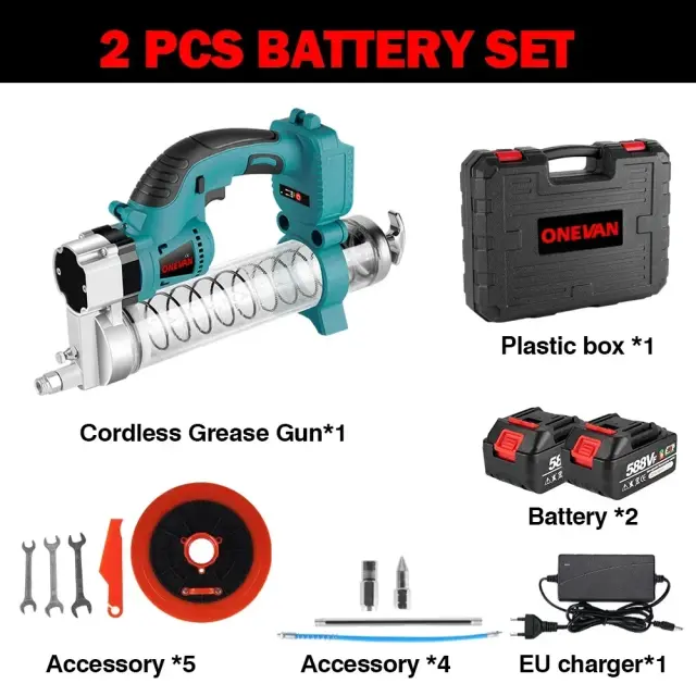Električna mastna pištola, visok tlak 69MPA, brezkrtačni motor, vključuje 2 bateriji, 2 baterijski EU vtič
