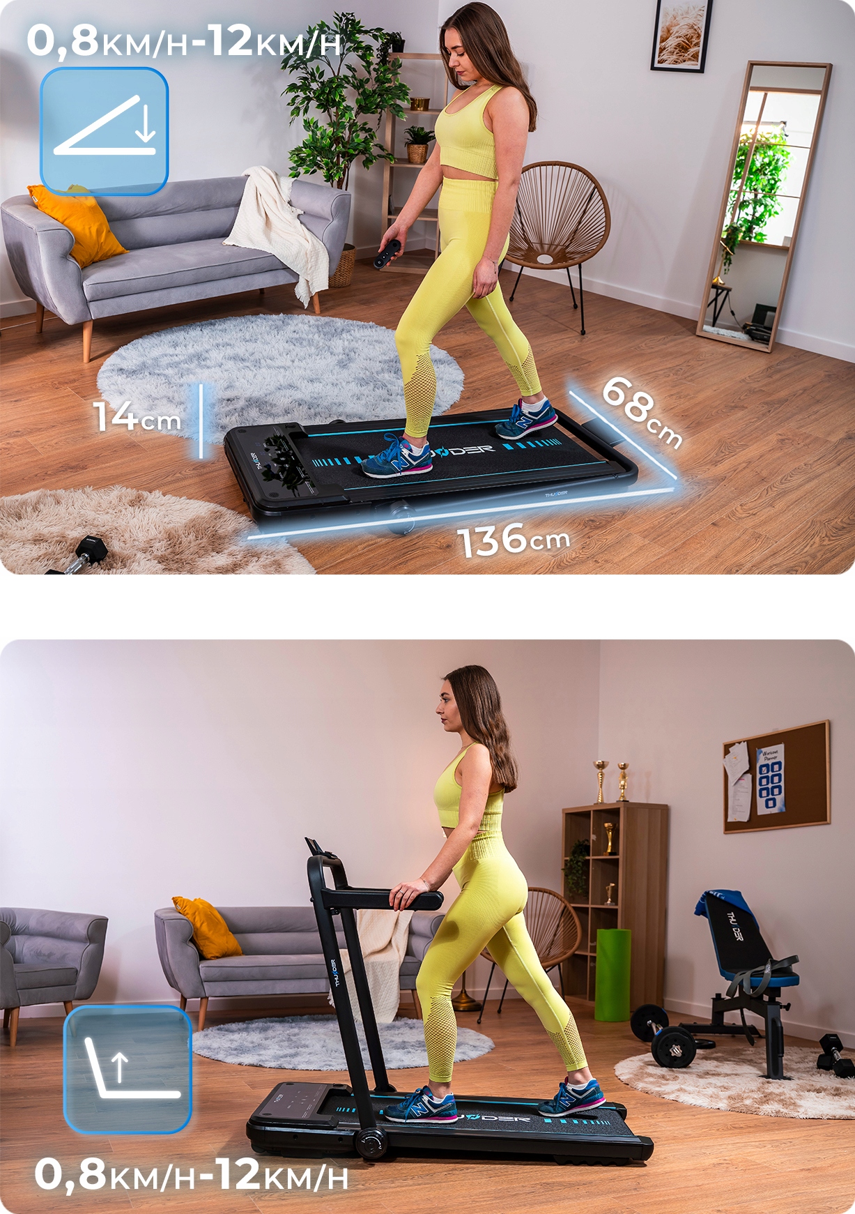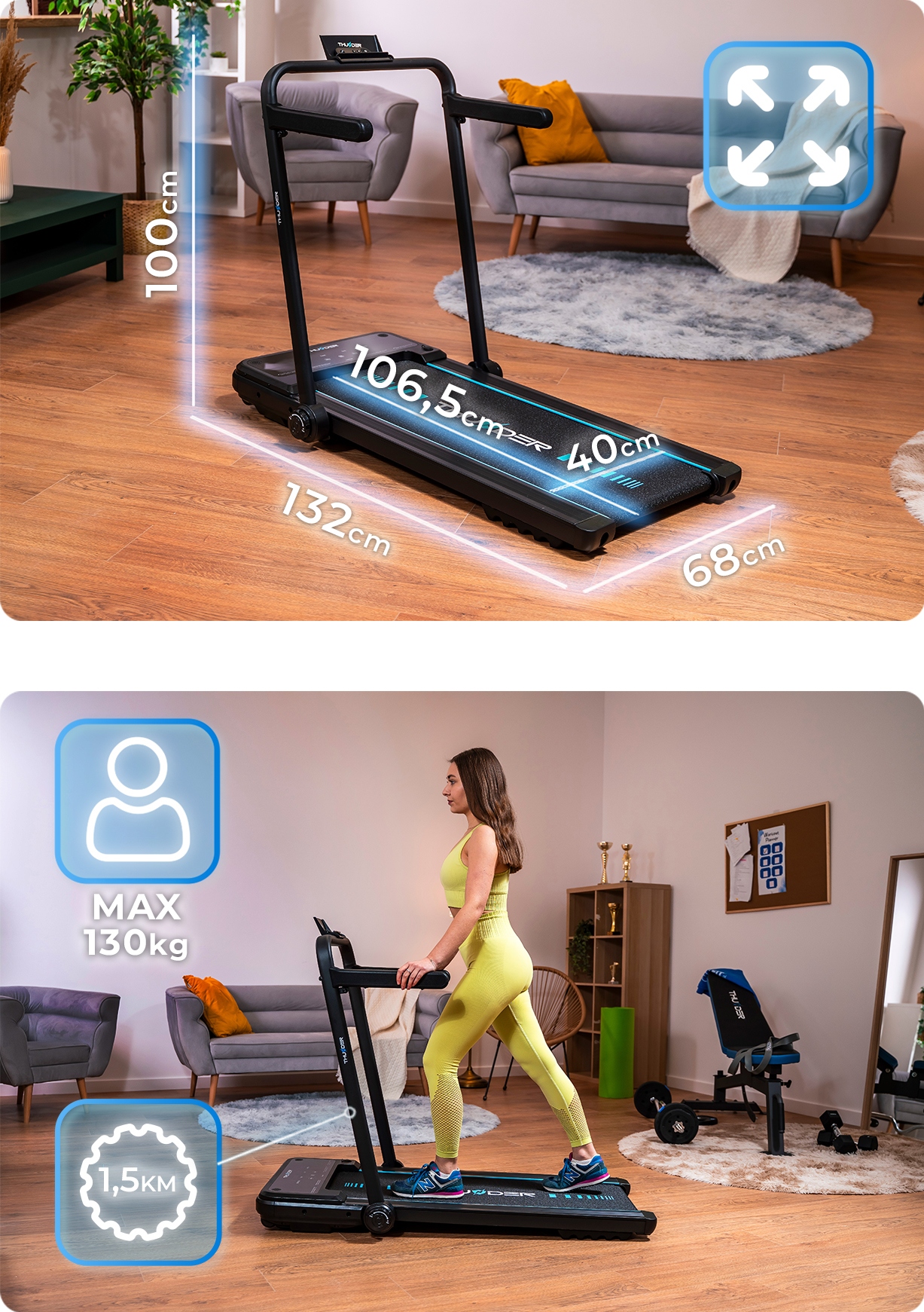 Mere razložene tekalne steze: 68 cm (širina) x 132 cm (dolžina) x 100 cm (višina)