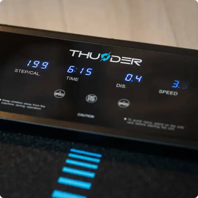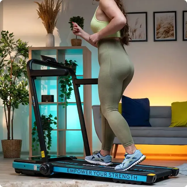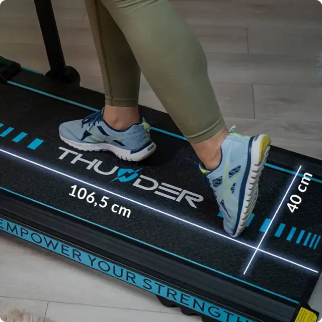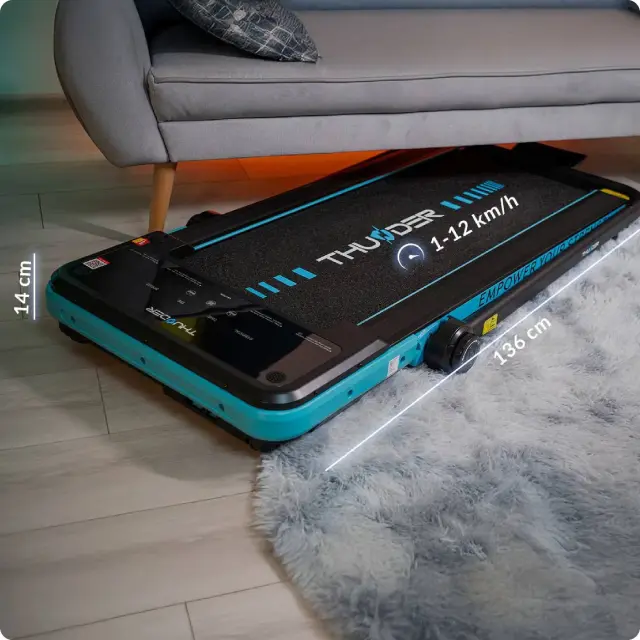 Električna nizkoprofilna zložljiva tekalna steza THUNDER® IMPACT-BLUE – 12 km/h, 1,5 KM, pod posteljo, Bluetooth, nosilnost 130 kg