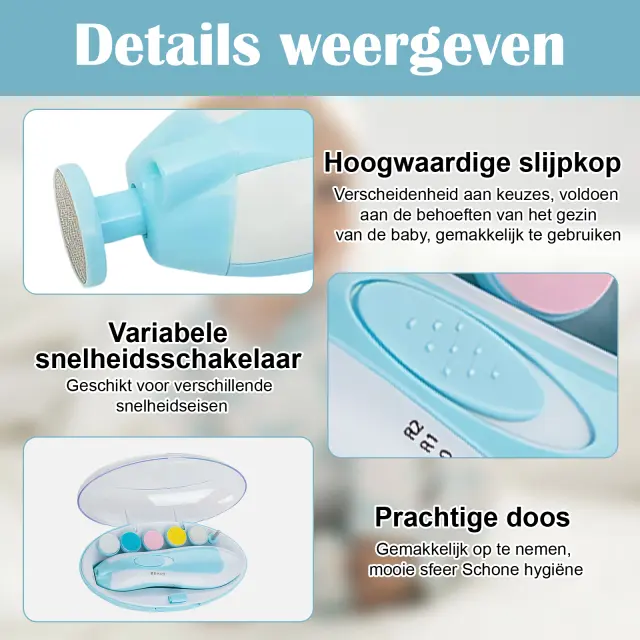 Zahvaljujoč tehnologiji krožnega brušenja 360° lahko nežno polirate in strižete nohte na rokah in nogah, ne da bi pri tem poškodovali občutljivo nohtno ležišče ali otrokovo kožo.