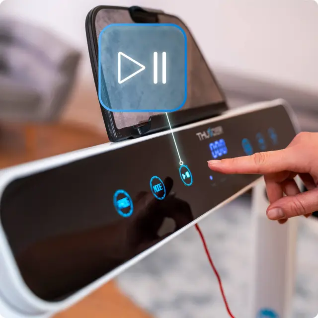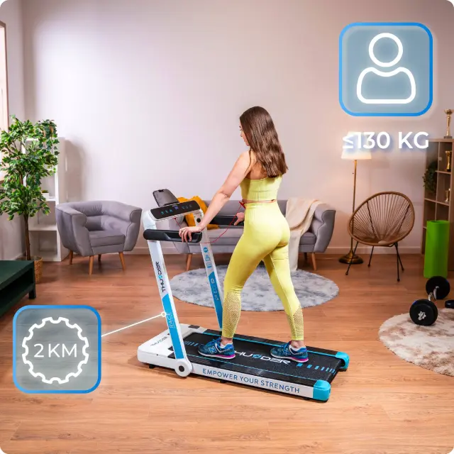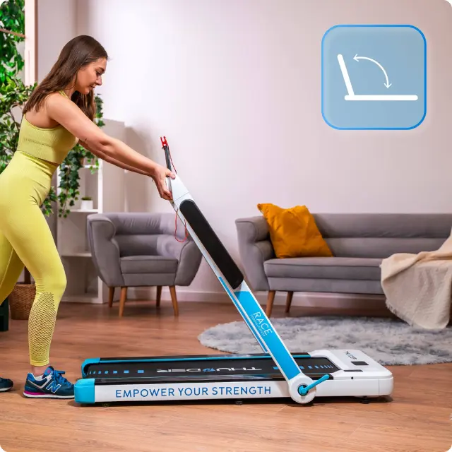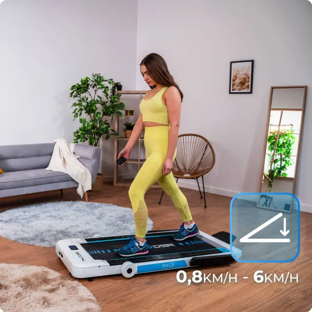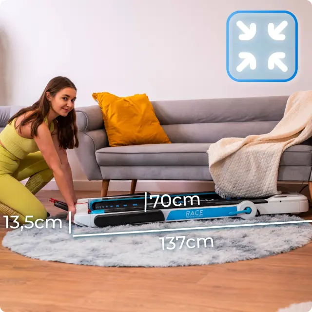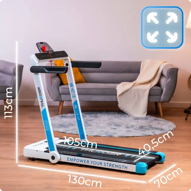 Električna pod-biro zložljiva tekalna steza THUNDER® RACE-WHITE– 14 km/h, 2 KM, 14 cm nizka zasnova, Bluetooth, nosilnost 130 kg
