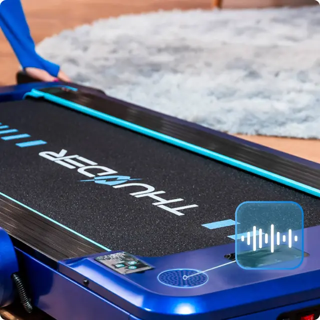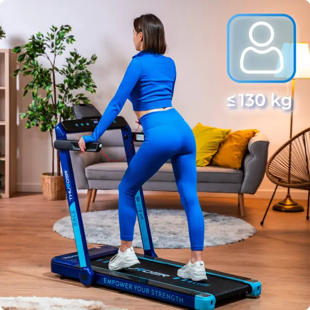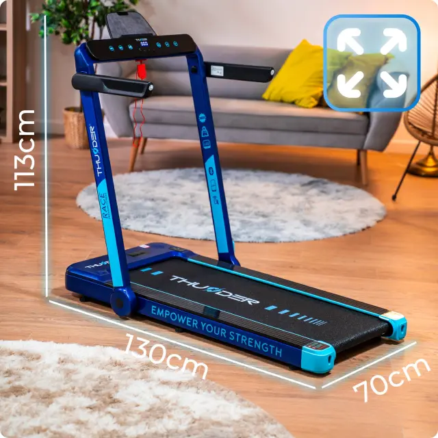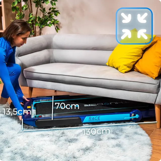 Električna pod-biro zložljiva tekalna steza THUNDER® RACE-BLUE – 14 km/h, 2 KM, 14 cm nizka zasnova, Bluetooth, nosilnost 130 kg