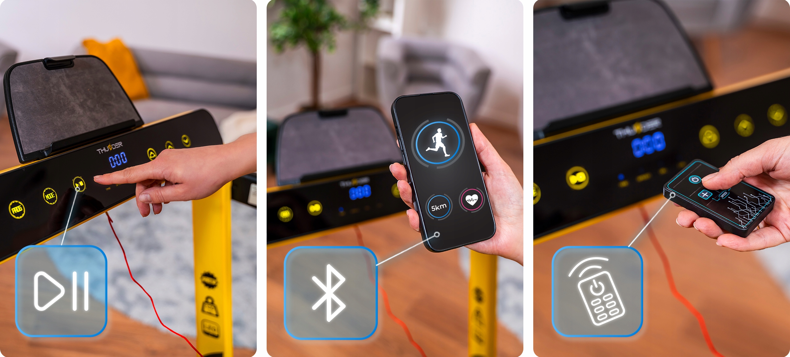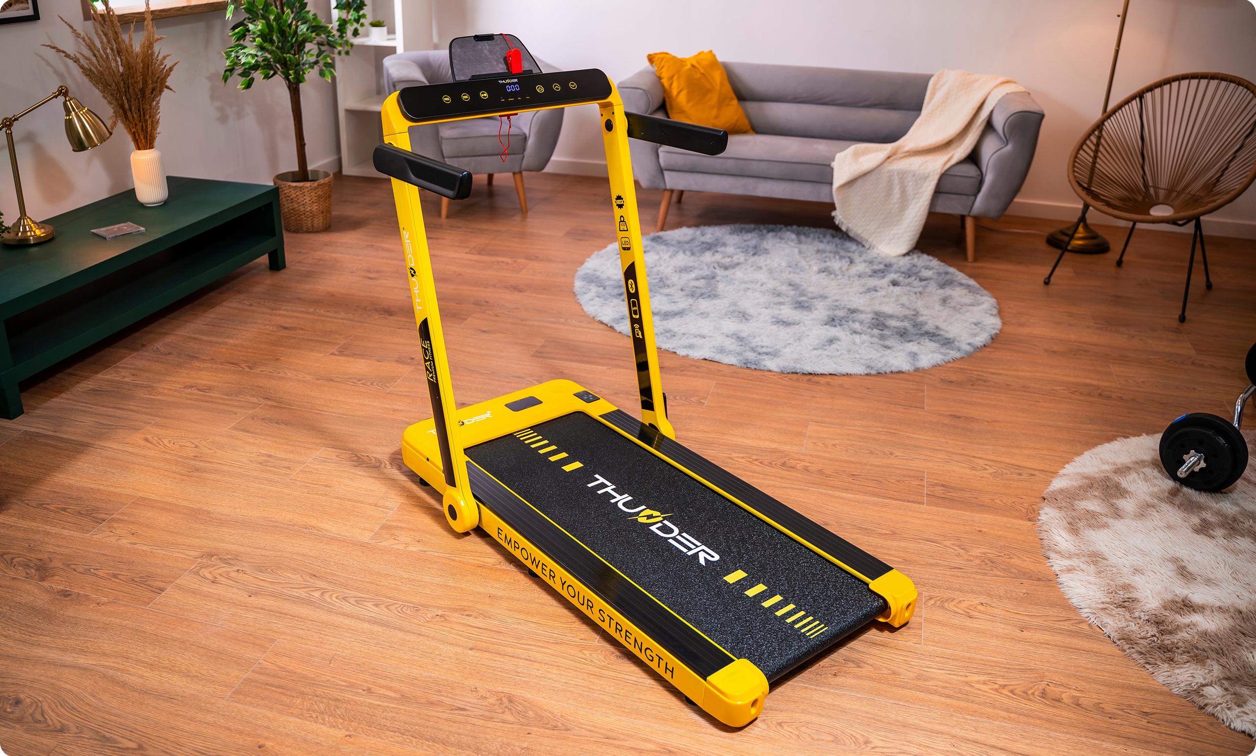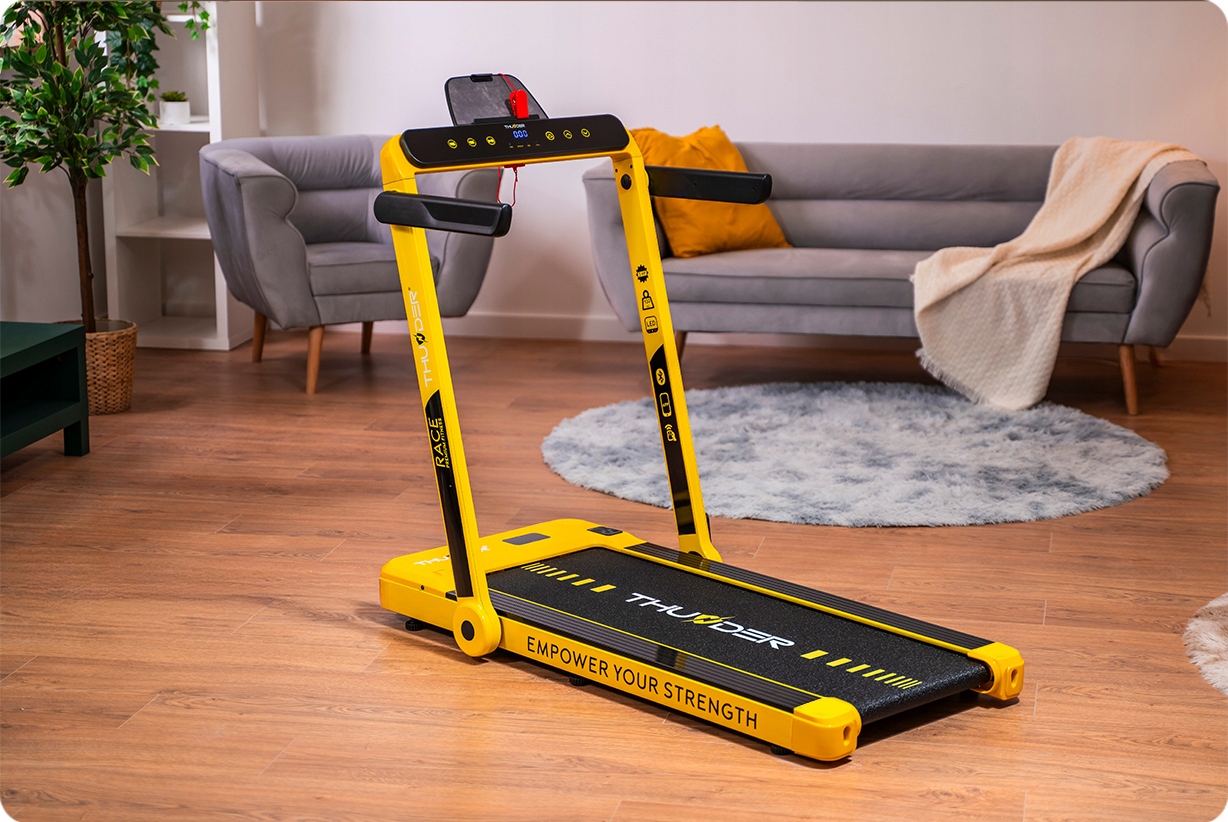 Iščete kompaktno in napredno napravo za domačo vadbo? Tekalna steza THUNDER® RACE-GOLD je idealna rešitev, ki združuje udobje, funkcionalnost in sodobne tehnologije ter zagotavlja učinkovito vadbo vsak dan.