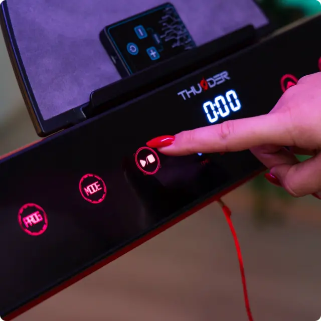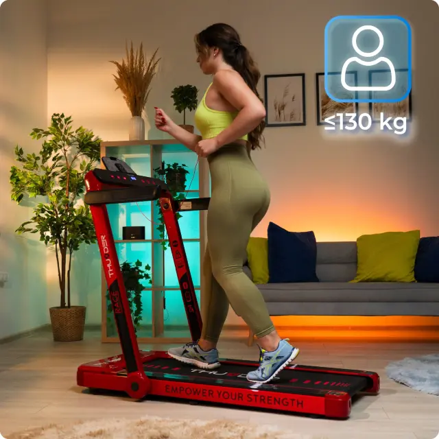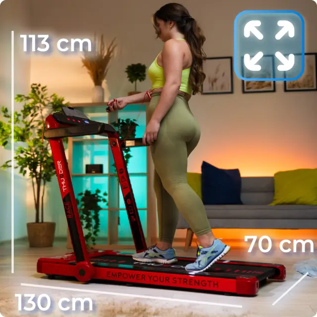 Električna pod-biro zložljiva tekalna steza THUNDER® RACE-RED – 14 km/h, 2 KM, 14 cm nizka zasnova, Bluetooth, nosilnost 130 kg