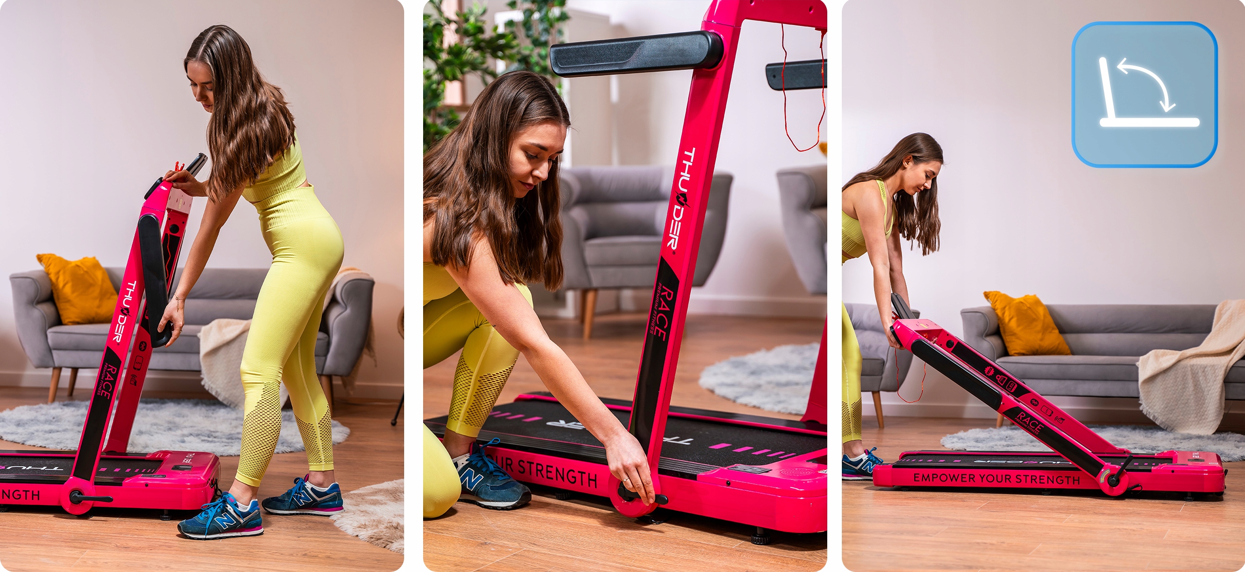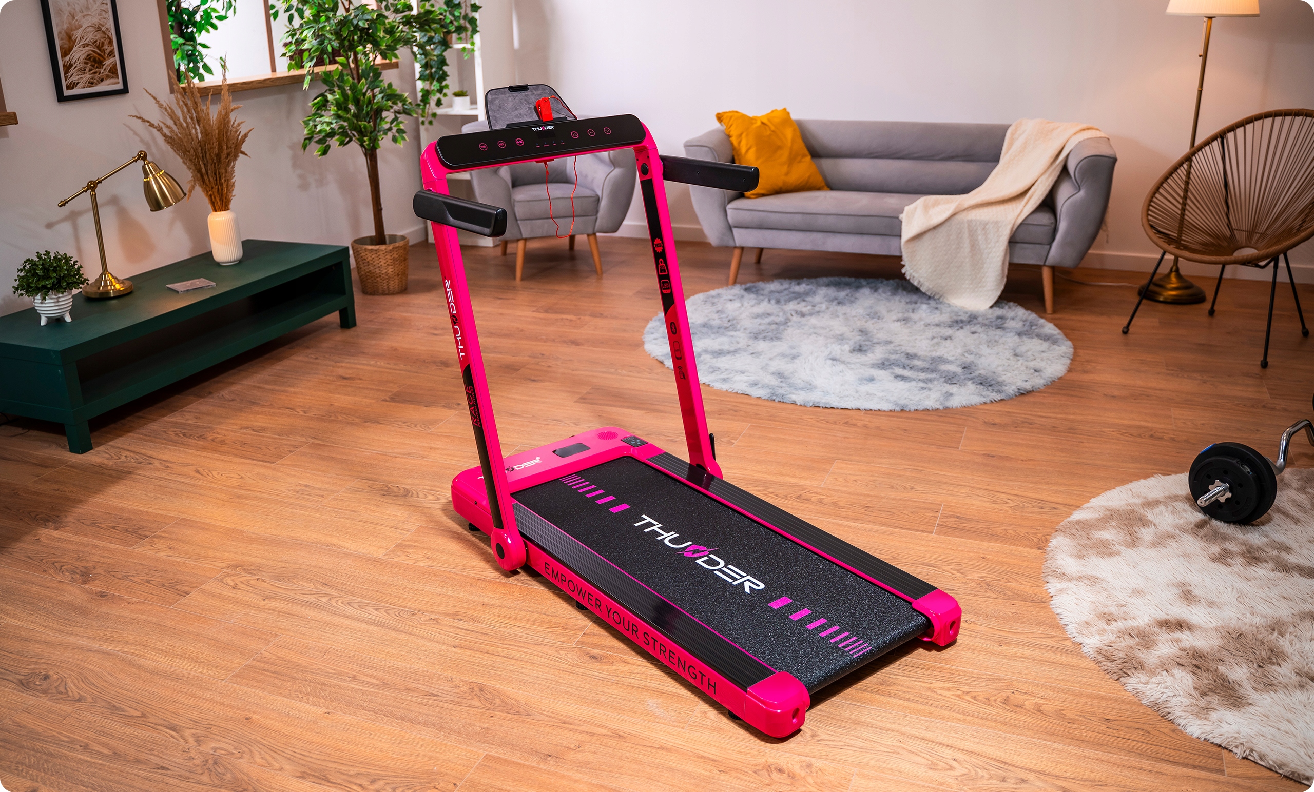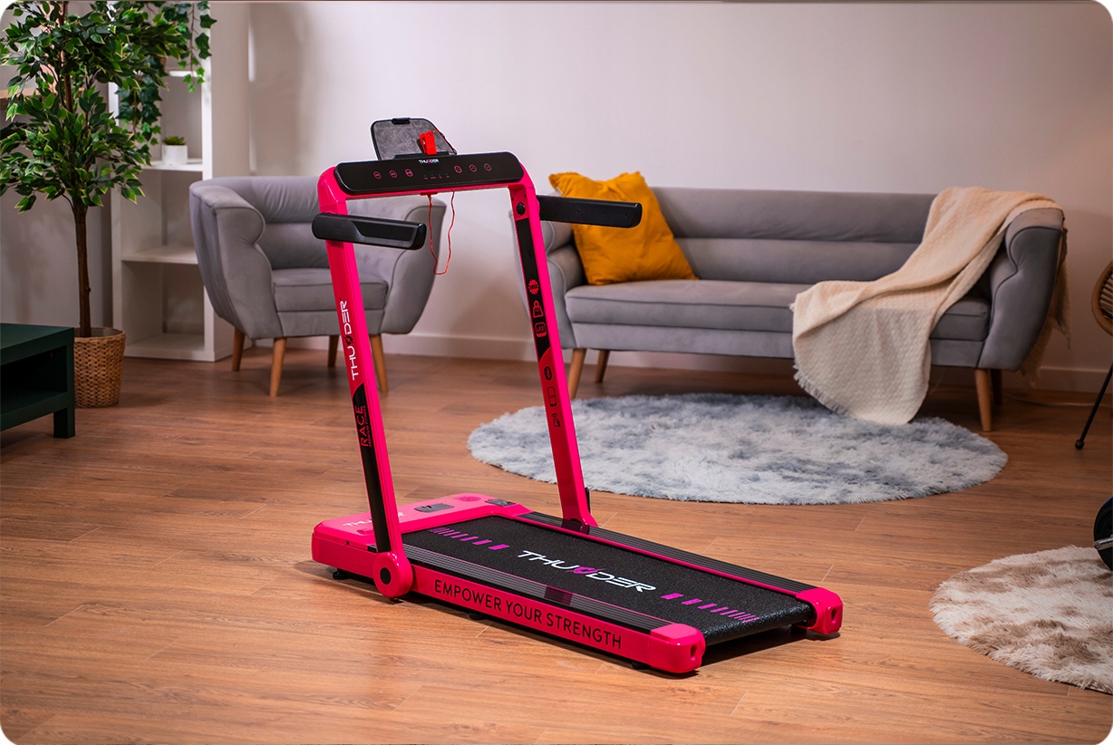 Iščete kompaktno, a hkrati napredno napravo za vadbo doma? Tekalna steza THUNDER RACE-PINK je idealna rešitev, ki združuje udobje, funkcionalnost in sodobne tehnologije ter zagotavlja učinkovito vadbo vsak dan!