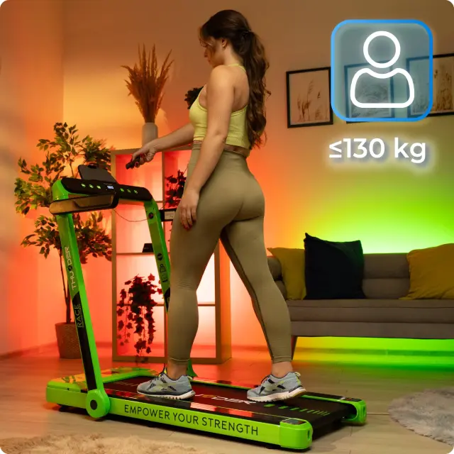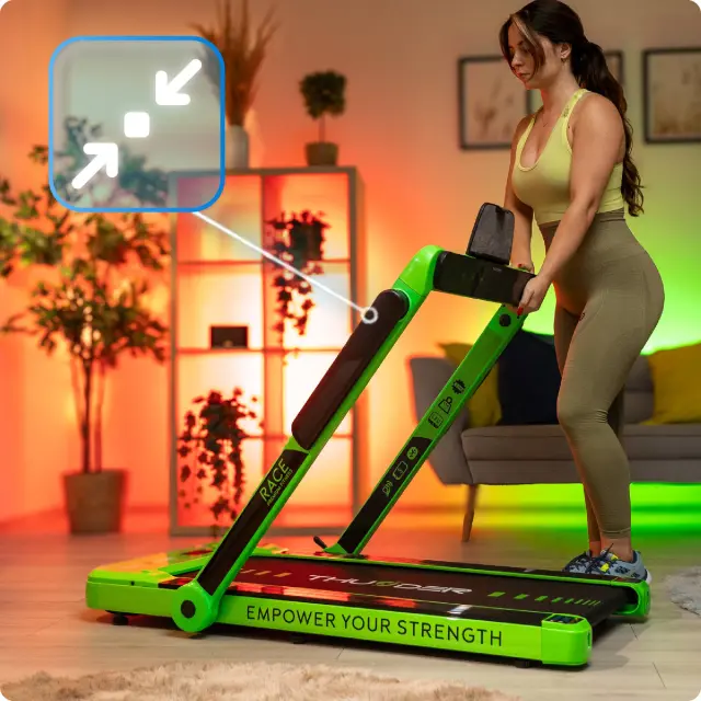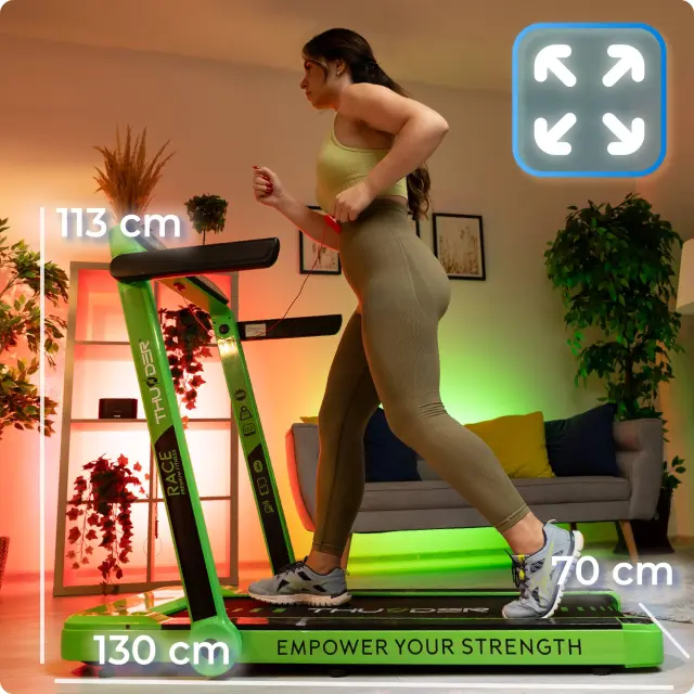 Električna pod-biro zložljiva tekalna steza THUNDER® RACE-GREEN– 14 km/h, 2 KM, 14 cm nizka zasnova, Bluetooth, nosilnost 130 kg
