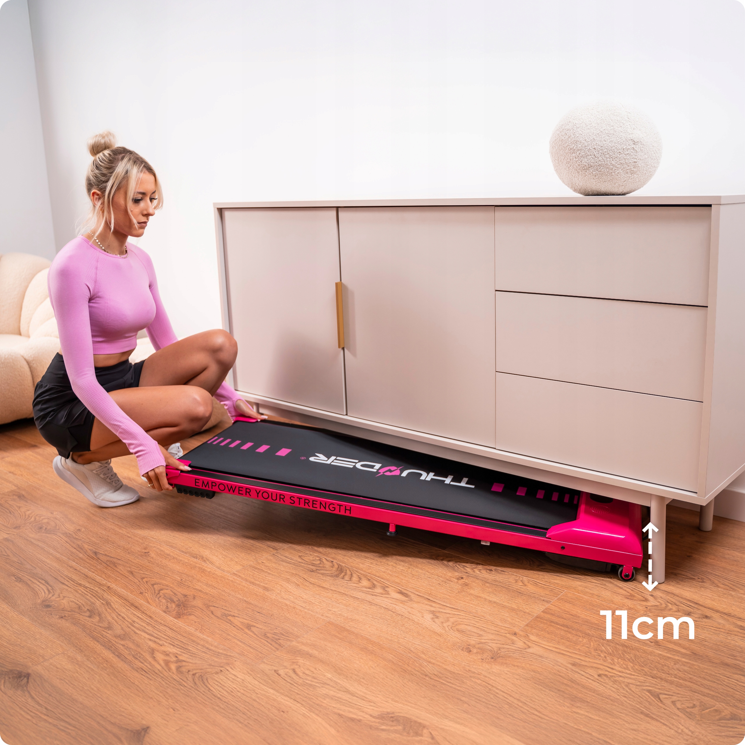 Tekalna steza z višino le 11 cm se prilega skoraj vsakemu prostoru – pod posteljo, kavčem ali v omari. Po končani vadbi jo hitro pospravite in si povrnete prostor, ko pa ste znova pripravljeni na gibanje, je v trenutku pripravljena za uporabo.