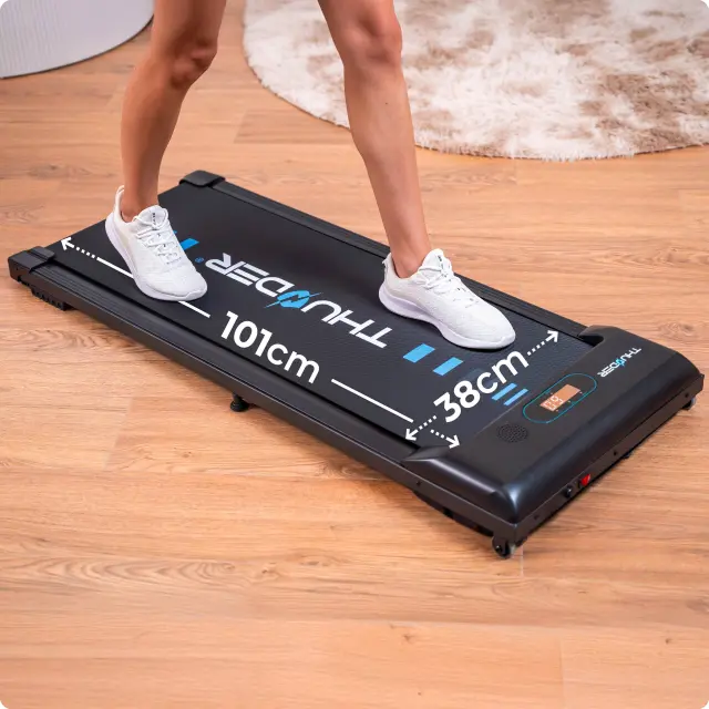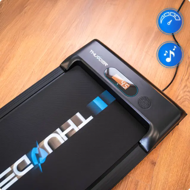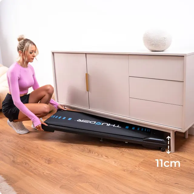 Električna pod-mizo tekalna steza THUNDER® IDEA-BLACK – 6 km/h, 1,5 KM, 11 cm ultratanka, Bluetooth, LED zaslon, nosilnost 100 kg