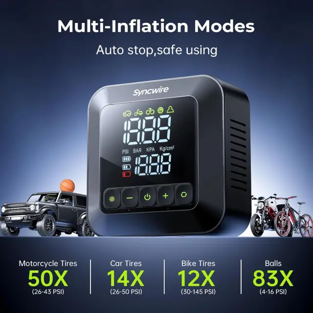 Syncwire Mini združuje visoko hitrost polnjenja in zanesljivo delovanje v kompaktni obliki, ki je nepogrešljiva na vsakem potovanju. Naprava z velikim zaslonom in različnimi načini uporabe zagotavlja popoln nadzor nad tlakom v vaših pnevmatikah in športnih rekvizitih. Zagotovite si to praktično orodje še danes in poskrbite za varno vožnjo v vseh okoliščinah.