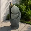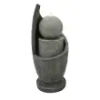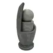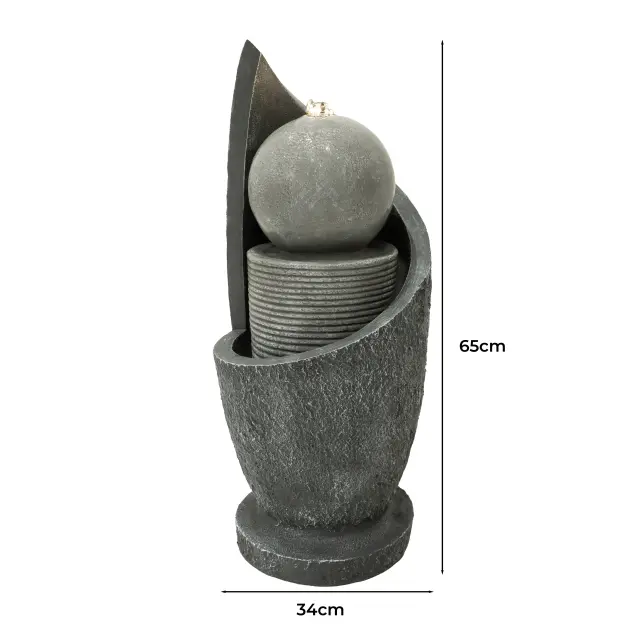 Ta vodni element, izdelan iz trpežne poliresine, je zasnovan tako, da prenese vremenske vplive, hkrati pa ohranja svoj prefinjen videz, podoben kamnu. Izstopajoča zasnova se osredotoča na gladko kroglo, ki nežno usmerja vodo po žlebljenem podstavku, obdano z elegantno ukrivljeno zunanjo lupino, ki elementu doda globino in dimenzijo. Ena sama topla bela LED lučka nežno osvetljuje kroglo in ustvarja mehak, ambientalni sij, ki še posebej zvečer poudari sproščujoče vzdušje.