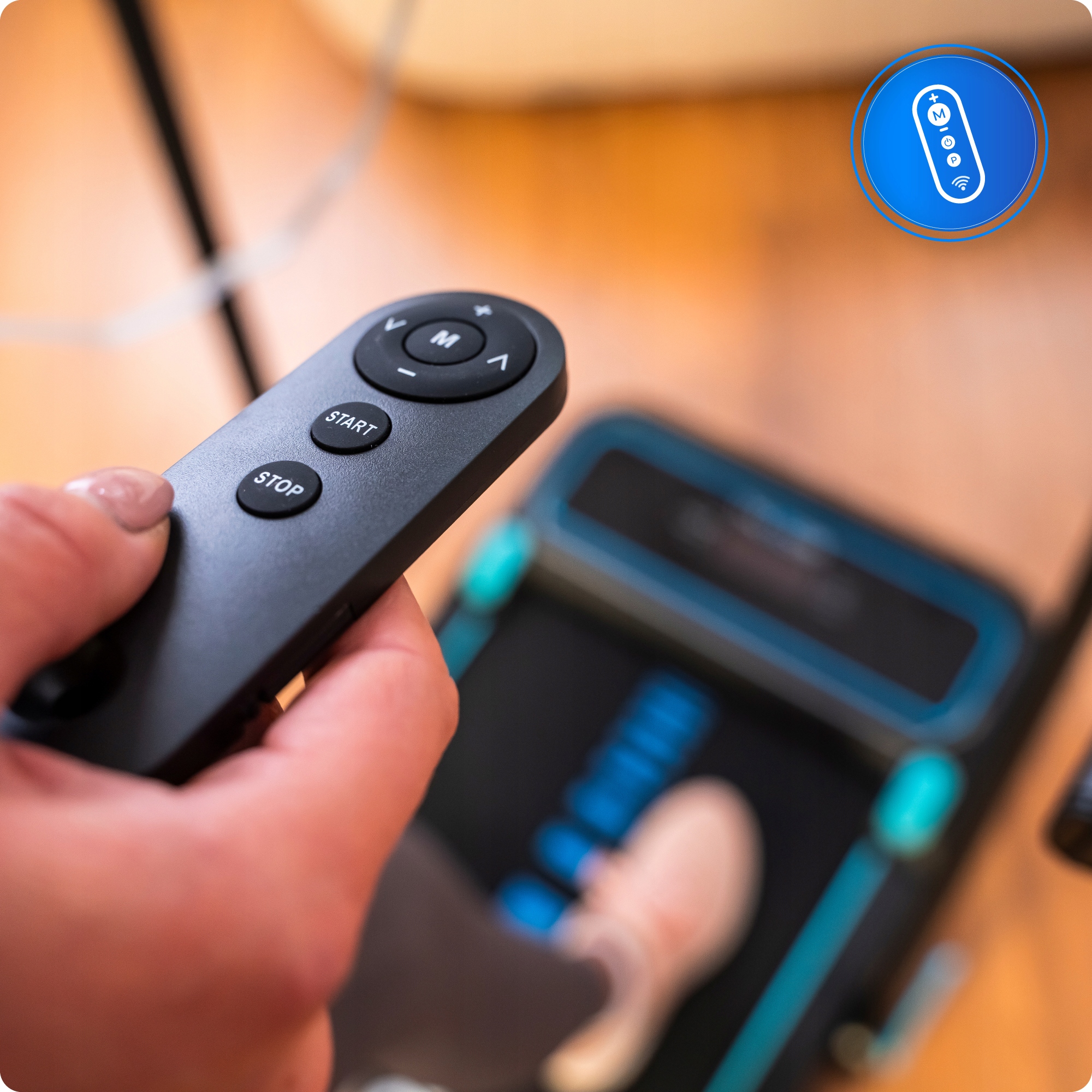 Tekalno stezo upravljajte z daljinskim upravljalnikom ali gumbi na konzoli – brez sklanjanja.