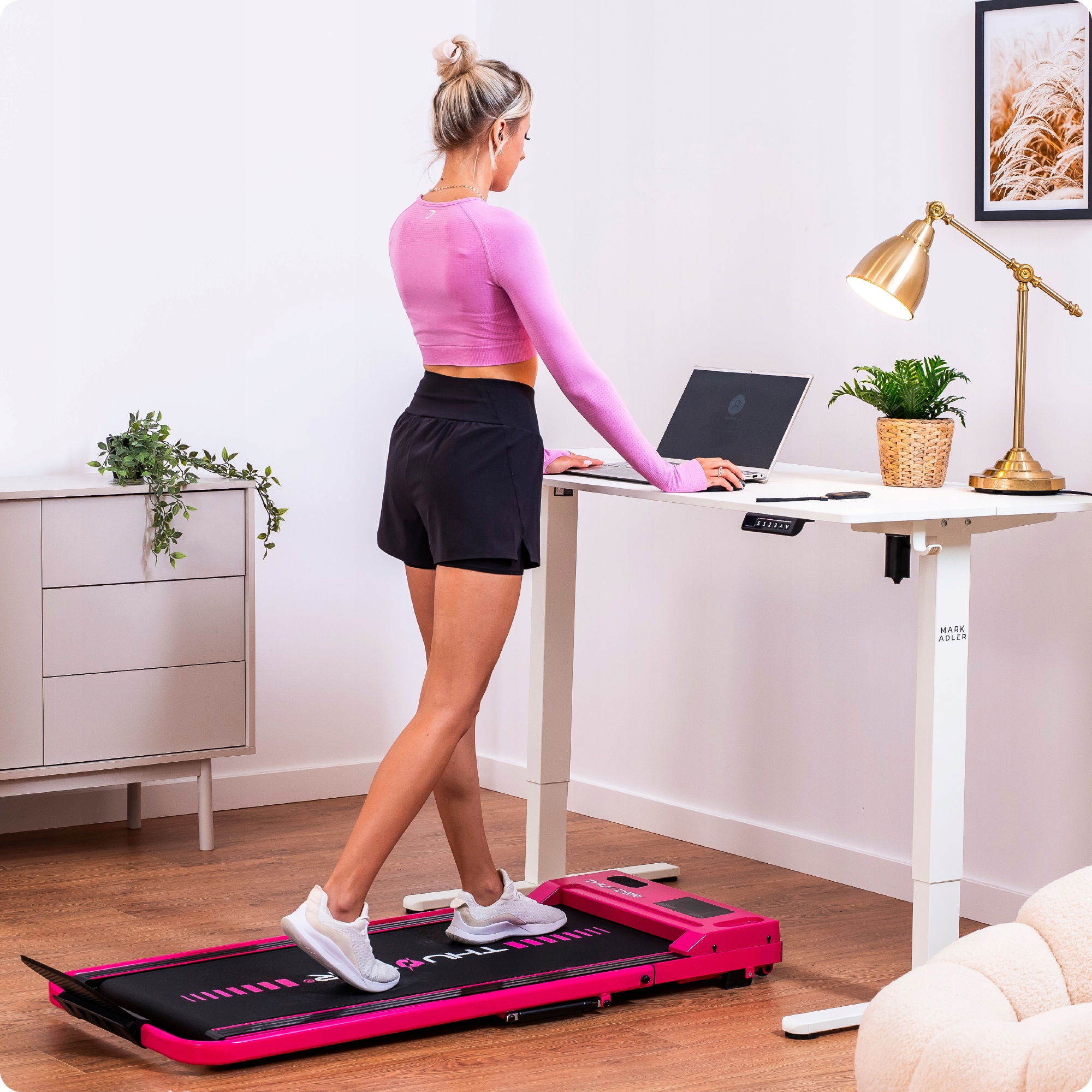 Zahvaljujoč izjemno tanki konstrukciji se tekalna steza prilega pod vsako mizo in omogoča udobno vadbo tudi med delom. Eleganten dizajn in tiho delovanje ustvarjata razkošno kombinacijo udobja, zdravja in sloga.