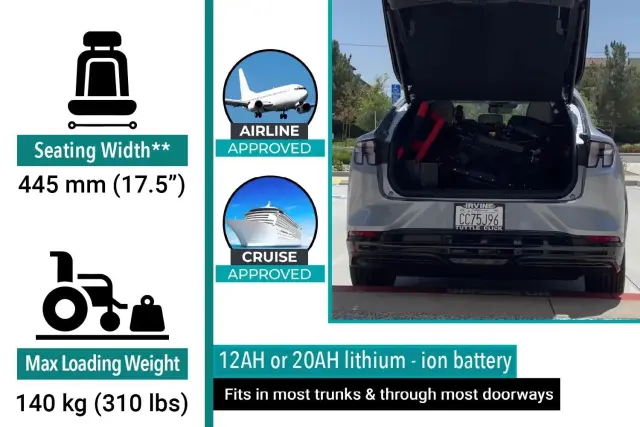 Izbirate lahko med dvema litij-ionskima baterijama. Standardna 12Ah baterija (288WH) je odobrena za letalski in ladijski promet ter nudi doseg do 20 km. Za daljše poti je na voljo opcijska 20Ah baterija (480WH), ki poveča doseg do 30 km (ni odobrena za letala). Baterije se lahko polnijo na vozičku ali samostojno, čas polnjenja pa znaša med 6 in 8 ur.