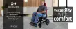 Sedež širine 460 mm je opremljen z zračno blazino in hrbtiščem za enostavno vzdrževanje in udobje, vključno z naslonom za glavo. Voziček ima spredaj 8-palčna polna kolesa in zadaj 12-palčna pnevmatska kolesa (z zračnico) za blaženje tresljajev. Oba naslona za roke sta dvižna, kar olajša presedanje ali dostop do mize.