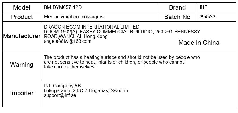 Izdelek ima grelno površino in ga ne smejo uporabljati osebe, ki niso občutljive na toploto, dojenčki ali otroci ali osebe, ki ne morejo skrbeti zase.