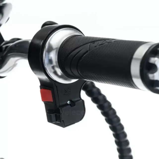 Izdelek je električni mobilni voziček, model Veleco ZT16. Na sliki je prikazan del nadzorne plošče, kjer so vidni LED indikatorji za moč in nivo baterije. Indikatorji so osvetljeni v različnih barvah, kar uporabniku omogoča enostavno spremljanje stanja vozička. Znamka Veleco je znana po svojih električnih mobilnih rešitvah.