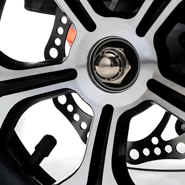 Izdelek je električni mobilni voziček, model Veleco ZT16. Na sliki je prikazan del kolesa, ki vključuje aluminijasto platišče z večkrakim dizajnom in vidno matično vijak. Kolo ima tudi odprtine, kar lahko pripomore k zmanjšanju teže in izboljšanju aerodinamike. Celoten izgled kaže na sodobno in robustno zasnovo, primerno za mobilnost.