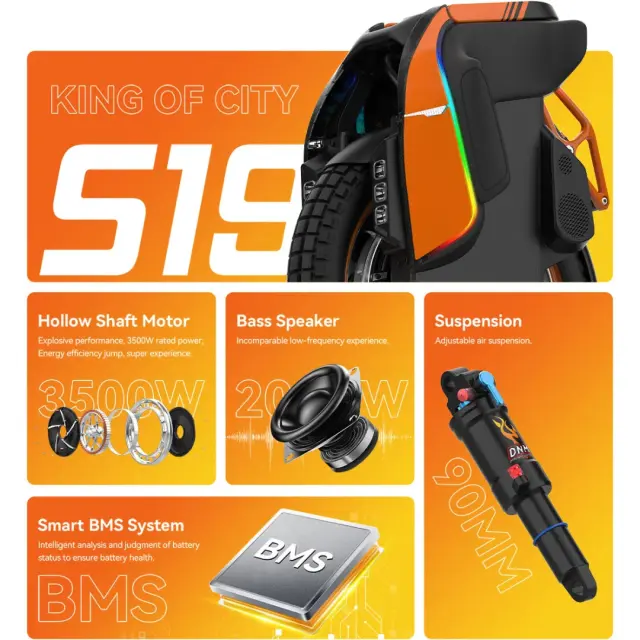 Srce monocikla S19 Pro je inovativen motor z votlo gredjo (Hollow Shaft Motor), ki se ponaša z nazivno močjo 3500 W in maksimalno močjo kar 6500 W. Ta izjemna moč zagotavlja eksplozivne pospeške in omogoča premagovanje klancev z naklonom do 40°. Napredna modularna zasnova matične plošče s TO-247 MOS tranzistorji in učinkovitim odvajanjem toplote zagotavlja stabilnost in najvišjo možno zmogljivost.