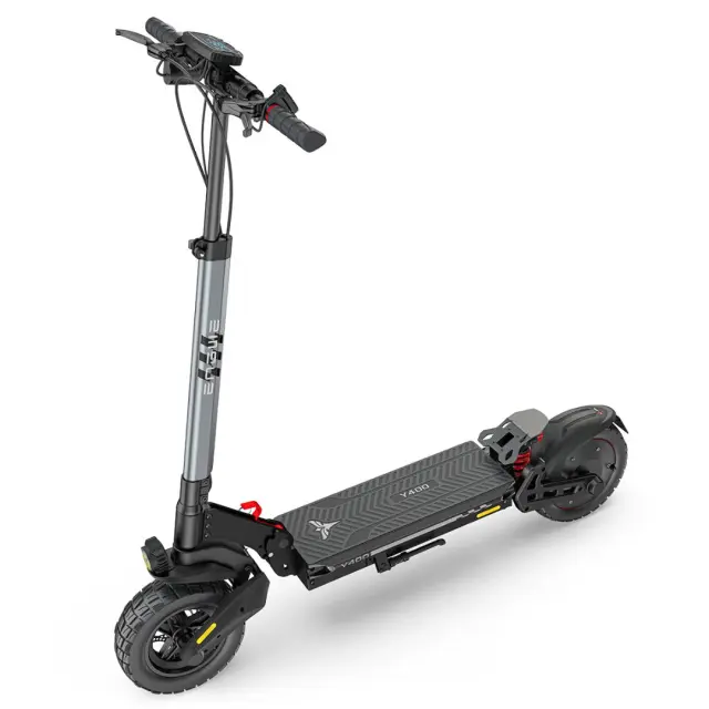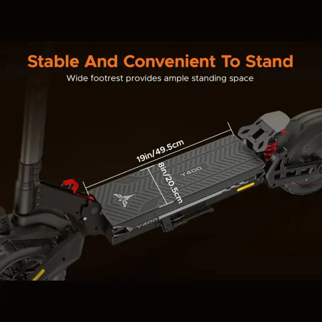 Vožnja preko lukenj in robnikov še nikoli ni bila tako gladka. Y400 se ponaša z naprednim dvojnim vzmetenjem v obliki črke C (C-Shaped Strong Suspension), ki drastično zmanjša prenos vibracij na voznika.