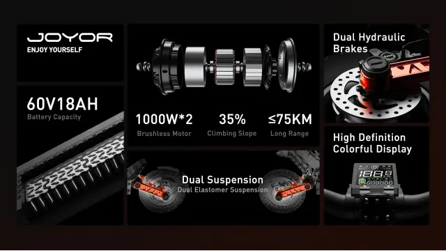 Električni skuter JOYOR S10-S-Z z dvojnim pogonom: terenske pnevmatike 1000 W*2, doseg 75 km, lahek, zložljiv