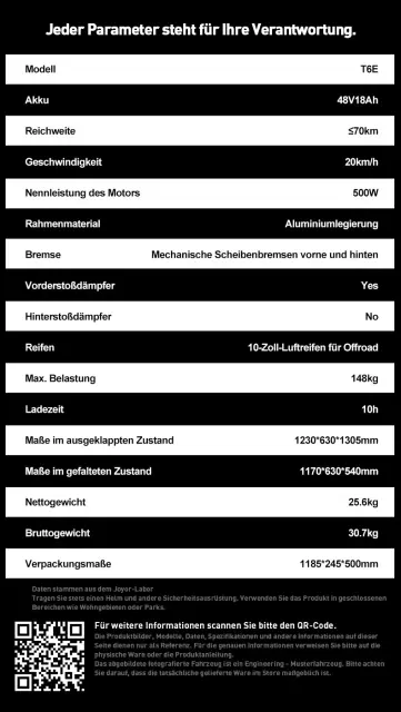 Električni skuter JOYOR T6E - 500 W motor, doseg 70 km, 10-palčne terenske pnevmatike, dvojno vzmetenje, zložljiv, baterija 48 V 18 Ah