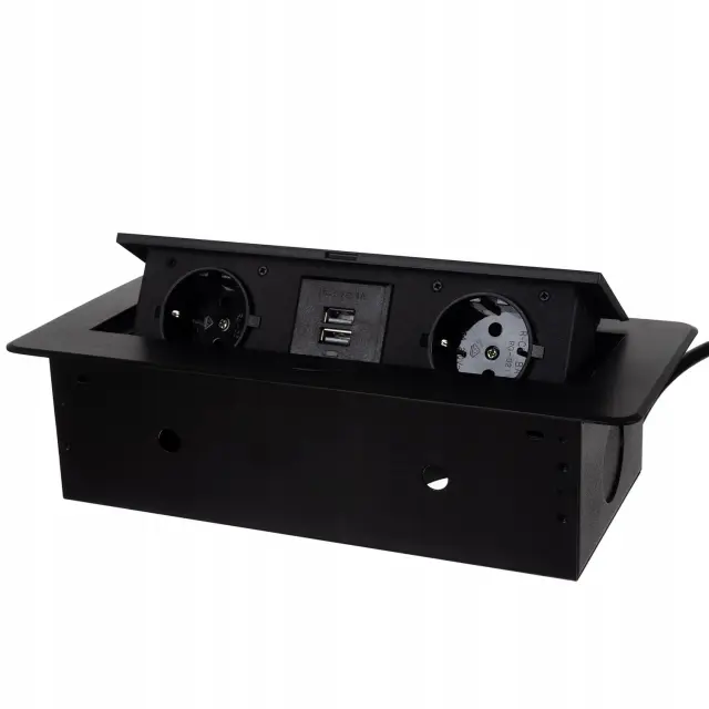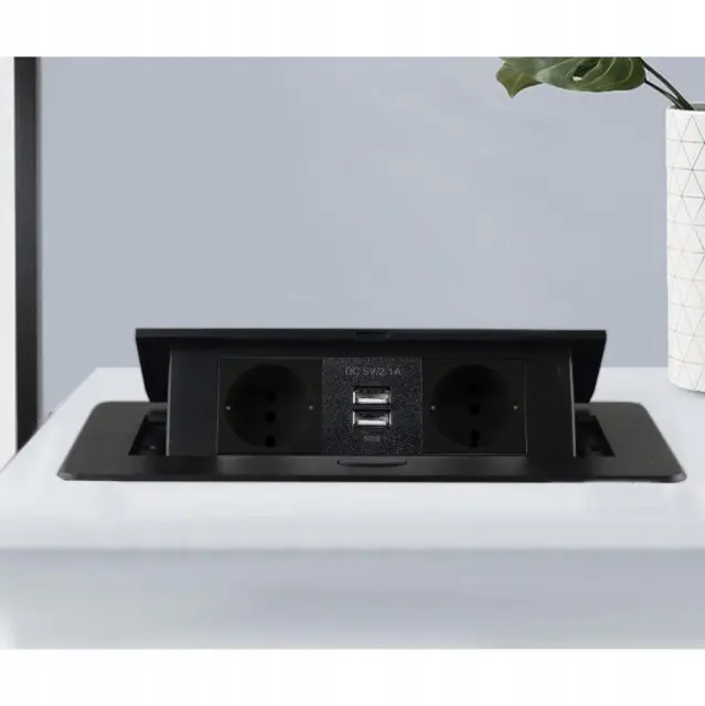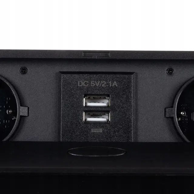 2 VTIČNICE + 2 USB – trak je sestavljen iz 2 šuko vtičnic z ozemljitvijo + 2 USB 2.1 vtičnic v ohišju, skritem v mizni plošči. Ohišje je izdelano iz visokokakovostnega prašno barvanega aluminija. Dodatni USB priključki vam omogočajo, na primer, polnjenje telefona neposredno iz vtičnice.