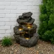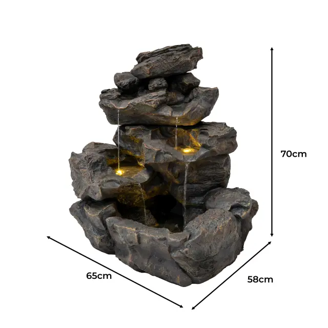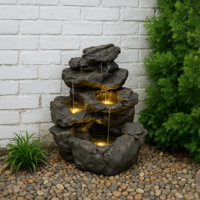 Rustic Rapids, strokovno izdelan iz visokokakovostnega poliresina, posnema videz in teksturo pravega kamna, hkrati pa ostaja lahek in enostaven za namestitev. Voda nežno teče z vrha skozi vrsto naravno oblikovanih kamnitih bazenov, ki posnemajo ritem in energijo gozdnega slapa. V elementu so strateško nameščene tri tople bele LED luči, ki mečejo mehak, ambientalni sij na žuboreče potočke, zaradi česar je ponoči prav tako očarljiv kot podnevi.