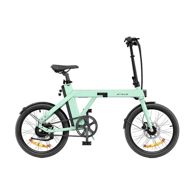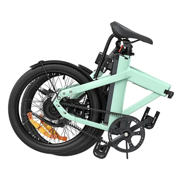 Izdelek je električno kolo, model Engwe P20. Na sliki je prikazano zloženo kolo v mint zeleni barvi. Vidni so sprednji in zadnji kolesi, zložena okvirna struktura ter sedež. Kolo je zasnovano za enostavno prenašanje in shranjevanje.