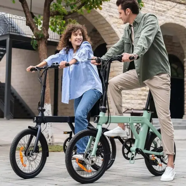 Na sliki je električno kolo znamke Engwe, model P20. Prikazani sta dve osebi, ki se zabavata na kolesih v urbanem okolju. Obe kolesi imata kompaktno zasnovo, z manjšimi kolesi in modernim videzom. Osebi sta oblečeni v sproščena oblačila, kar nakazuje, da se kolesarjenje dogaja v sproščenem vzdušju. V ozadju so vidne arhitekturne značilnosti, ki dodajajo mestni pridih.