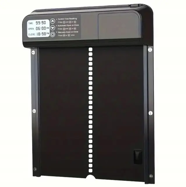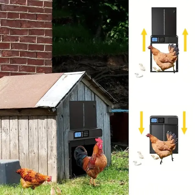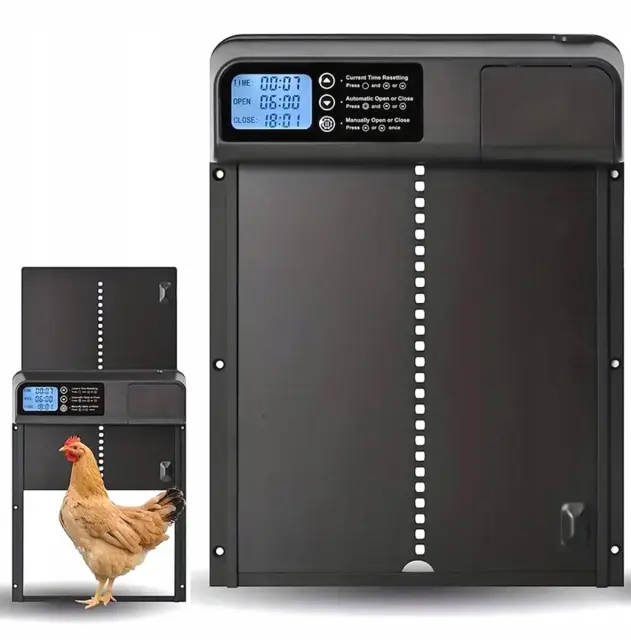 Ta inovativna rešitev zagotavlja popolno avtomatizacijo odpiranja in zapiranja vrat, kar ščiti vaše kokoši pred plenilci in vremenskimi vplivi. Robustna črna zasnova se popolnoma zlije s katerim koli kokošnjakom, medtem ko je enostavna uporaba idealna za začetnike in izkušene rejce.