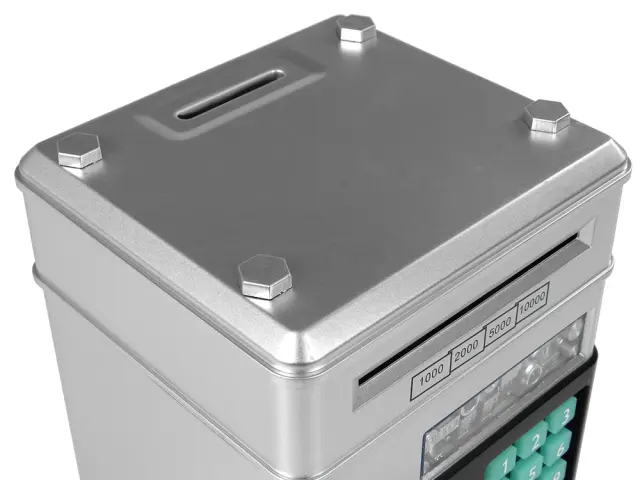 Vse je narejeno iz plastike, struktura je varna za otroka. Sef je srebrne in črne barve. Popolnoma se bo ujemal z otroško sobo.