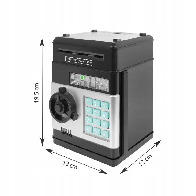 SPECIFIKACIJA – vrata se odprejo po vnosu 4-mestne PIN kode; možnost vnosa lastnega gesla; za bankovce in kovance; starost otroka 6+; sposobnost spreminjanja zvokov v glas; po 20 sekundah vas sef opomni na odprta vrata; mere (višina/širina/globina): 19,5/13/12 cm; teža: 0,55 kg